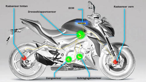 Die Zeit als Synchronuhren und Stroboskoplampe als HighTechWerkzeuge galten ist vorbei. Die Elektronik hat besonders in den letzen fünfzehn Jahren die Entwicklung der Motorradtechnik geprägt. War früher die Spitzenleistung des Motors das Hauptargument für Sportlichkeit, spricht man heute auch über Fahrbarkeit und Traktion. Fahrwerksparameter werden in Echtzeit angepasst. Realisierbar ist das nur mit leistungsfähigen Steuer- und Regelsystemen.Die Grafik zeigt welche Elemente für die Traktionskontrolle zusammenspielen(<-- mousover)