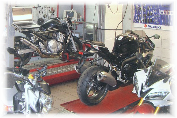 Grundlage für die Wartung, Inspektion und Reparatur an modernen Motorrädern ist eine hochwertige und umfassende Werkstattausrüstung. Neben fahrzeugspezifischen Spezialwerkzeugen gehören dazu immer mehr elektronische Diagnosewerkzeuge zum auslesen von Fehlerspeichern, zur Synchronisation der Drosselklappen sowie zur Überprüfung von ABS, Motorsteuerung und verschiedener Sensoren. Unsere Werkstatt ist typenoffen und bietet Dir das komplettes Leistungspektrum rund um’s Motorrad.